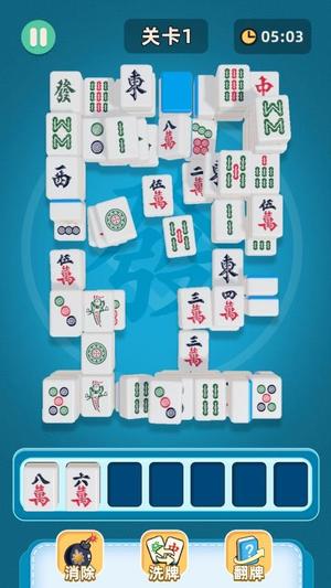 1、游戏采用经典麻将图案设计,玩家需要找出三个相同麻将进行消除,堆叠的麻将增加了寻找难度。