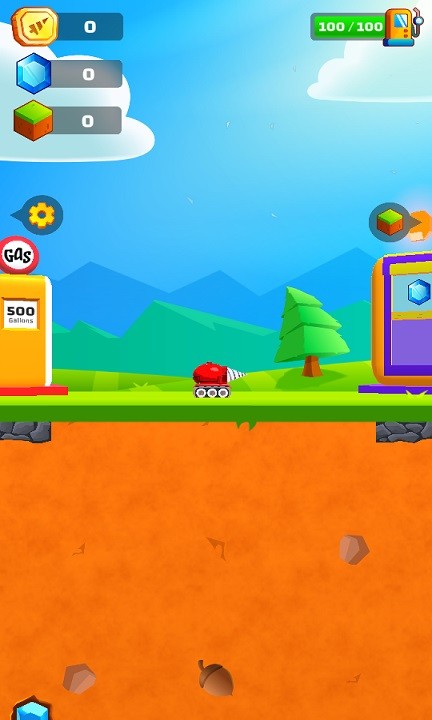 1、控制红色小车在绿色平台移动,注意右上角99/100油量,左侧加油站显示500加仑,收集三种资源升级装备。