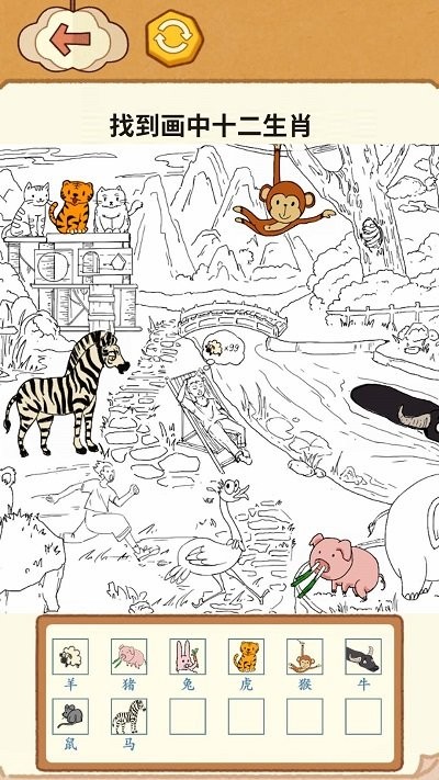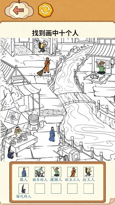 3、看古人找茬游戏画面,按任务框提示找画中所有人,通过数人头完成找出画中所有人0/10挑战。