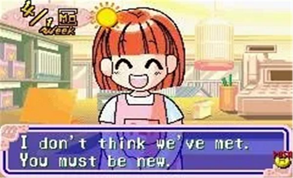 2、看左上角显示4月第一周,跟红发女孩对话,点蓝色对话框继续剧情。