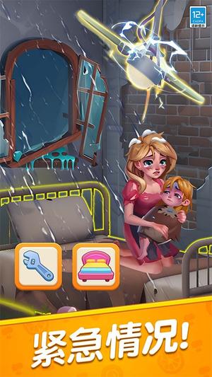 2、滑动屏幕进行方块合成,收集木材、金币、装饰品等关键资源,用于修复地板、墙壁、门窗等结构。